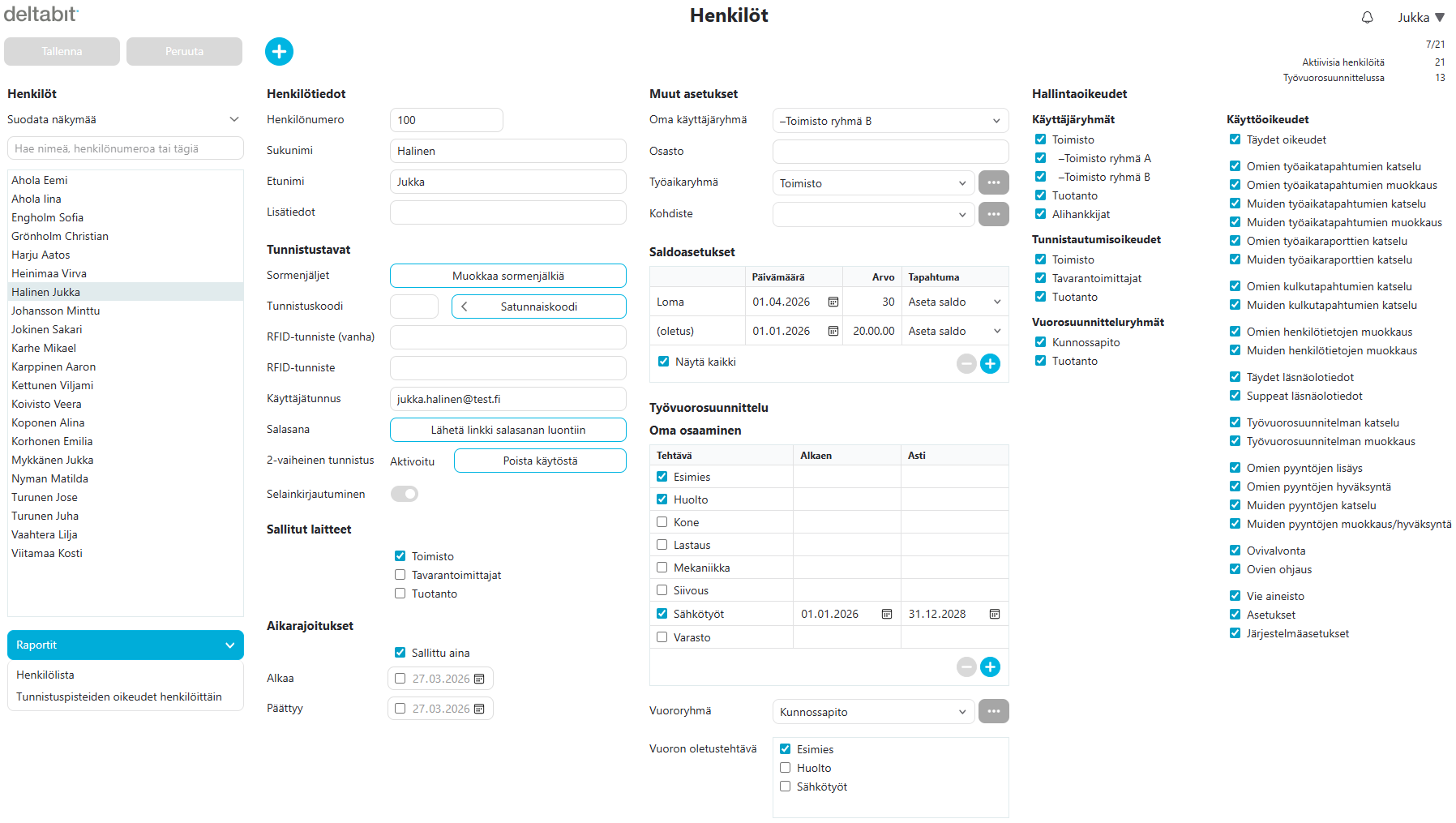 Henkilöt-näkymässä hallitset työntekijöiden tietoja. Näitä ovat mm. tunnistautumistiedot, käytettävä työajanlaskentamalli, alkusaldot, hallintaoikeudet ja henkilön omat käyttöoikeudet.