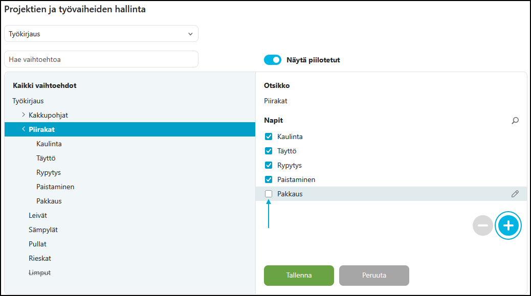 Piilotetut napit eivät ole leimattavissa. Jos valinta "Näytä piilotetut" ei ole aktiivisena, piilotetut napit piilotetaan myös muokkausnäkymästä. Tällöin näet ne napit, jotka ovat leimausnäkymässä aktiivisina. Työvaiheet- ja projektit -näkymässä näkyvät myös epäaktiiviset valinnat, jotta vanhoista projekteista voi hakea raportteja ilman, että niitä tarvitsee palauttaa leimattaviksi.