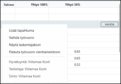 Valintojen lisäksi valikossa näytetään vuoron tarkastaneen, hyväksyneen ja siirtäneen henkilön nimi.