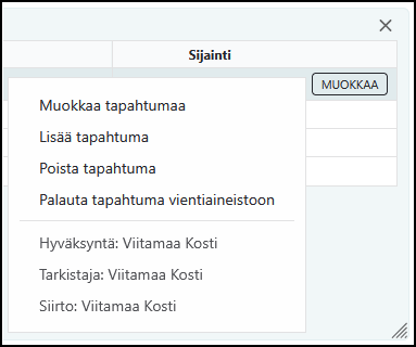 Valintojen lisäksi valikossa näytetään tapahtuman tarkastaneen, hyväksyneen ja siirtäneen henkilön nimi.