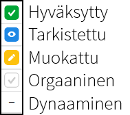 Vasemmanpuoleisin sarake näyttää hyväksyntä- ja muokkaustiedot. Tapahtuman tila voi olla joko hyväksytty (vihreä oikeinmerkki), tarkistettu (sininen silmä), muokattu (keltainen kynä) tai orgaaninen (harmaa oikeinmerkki). Dynaamisesti luotuja tapahtuja (viiva valkoisella pohjalla) ei voi muokata tai hyväksyä erikseen.