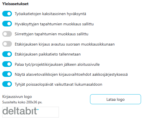 - Työaikalajit, joiden saldoa on mahdollista seurata. Kun työaikalaji on aktivoitu, saldoseuranta voidaan määrittää työaikaryhmäkohtaisesti Deltabitin toimesta.