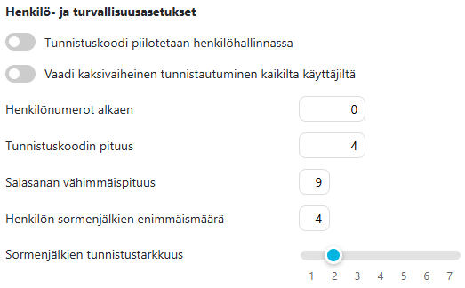 - Tunnistuskoodi piilotetaan henkilöhallinnassa: Henkilölle voi määrittää Henkilöt-sivulla tunnistautumiskoodin. Valinnalla määritetään, näytetäänkö vai piilotetaanko koodi henkilöt-sivulla.