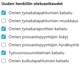 Tässä osiossa määritetään, mitkä oikeudet uusille henkilöille myönnetään automaattisesti heidän luomisensa yhteydessä. Oikeudet voidaan myöhemmin muuttaa henkilökohtaisesti henkilöhallinnassa.