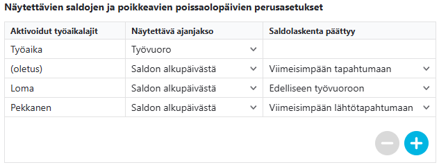 Tässä taulukossa määritetään, miten saldot ja poissaolopäivät näytetään kullekin työaikalajille. Kutakin aktivoitua työaikalajia kohden voidaan asettaa näytettävä ajanjakso ja saldolaskennan päättymishetki.