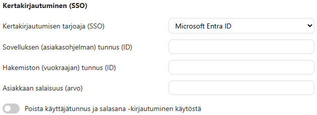 - Kertakirjautumisen tarjoaja (SSO): valitse käytössä oleva kertakirjautumisen palveluntarjoaja, esimerkiksi Microsoft Entra ID tai Google Workspace. Kirjautumisasetukset vaihtuvat palveluntarjoajan mukaan.