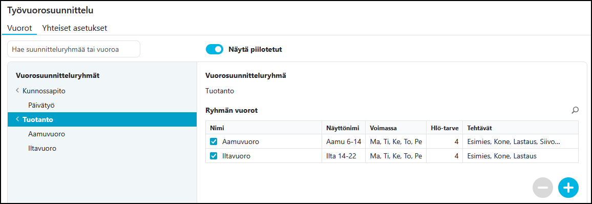 Poistamalla valinta "Näytä piilotetut" piilotetut vuorot häviävät näkyvistä myös Työvuorosuunnittelun hallintanäkymästä, jolloin näet vain ne vuorot, jotka ovat kulloinkin aktiivisessa käytössä suunnittelunäkymässä.