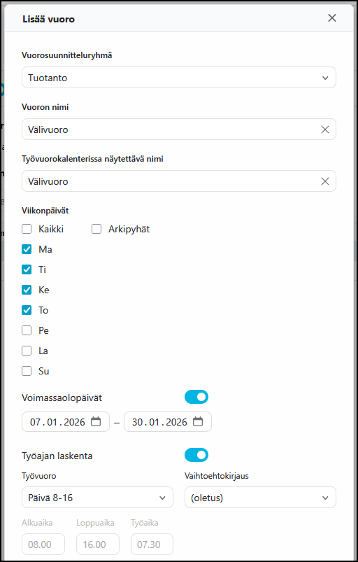Voimassaolopäivät: Määrittämällä vuorolle alku- ja loppupäivän vuoron voi rajata näkymään vain rajattuna aikana, valittuina viikonpäivinä. Jos voimassaolopäiviä ei valita, vuoro näkyy jokaisena valittuna viikonpäivänä päivämäärästä riippumatta.