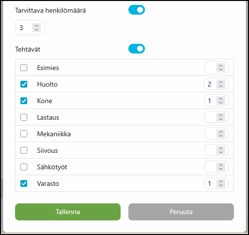 Tehtävät: Valitsemalla vuoroon järjestelmään määritettyjä tehtäviä määritetään, mitä tehtäviä vuorokortissa näkyy. Yksittäisille tehtäville voi myös määrittää erikseen henkilömäärät. Henkilön työvuorosuunnitelmassa näkyy vuoron nimen lisäksi tehtävä, johon hänet on suunniteltu.