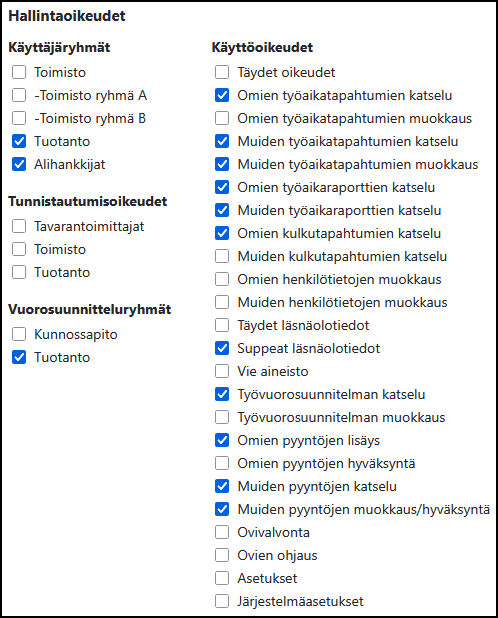 Oikeudet näkyvät vain, jos yrityksellä on käytössä työvuorosuunnittelu. Tämä osio määrittää, minkä vuorosuunnitteluryhmien vuorot näkyvät kyseiselle henkilölle työvuorojen suunnittelunäkymässä.